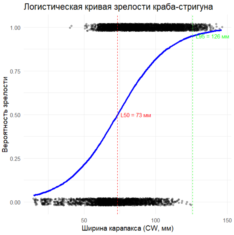 Это практическое занятие посвящено оценке параметров зрелости краба-стригуна опилио: L50 и L95 для последующего применения length-based методов в условиях ограниченных данных (LBSPR, LBB, LIME). Задача проста: понять, при каких размерах эти членистоногие начинают активно размножаться, чтобы мы могли грамотно их вылавливать, оставляя достаточное количество производителей для поддержания популяции.
