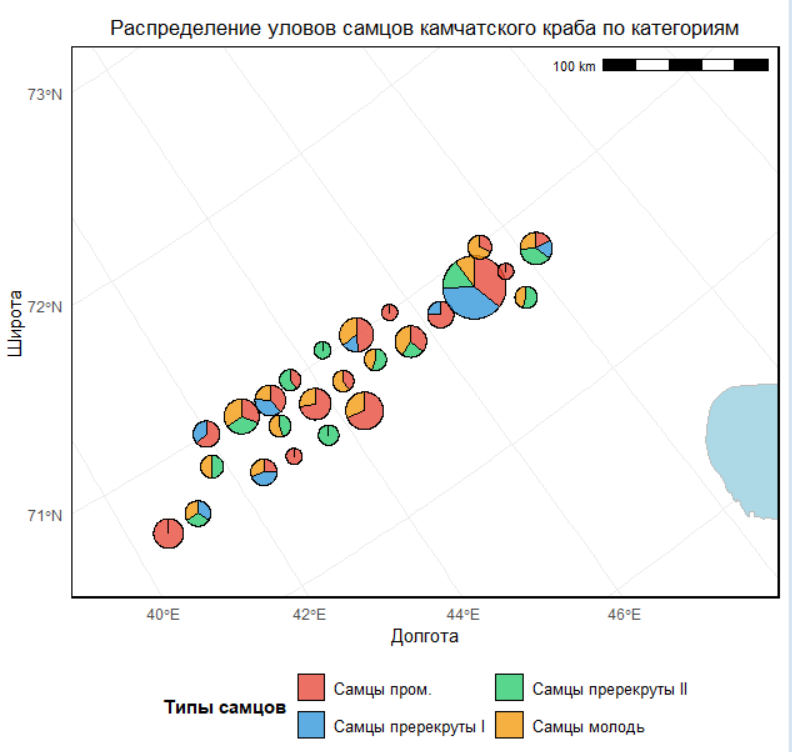 Картография — это не просто рисование границ и точек, это язык визуального мышления, который позволяет превращать сырые координаты и цифры в осмысленные пространственные истории. Когда мы накладываем на карту круговые диаграммы, мы совершаем важный переход от одномерной визуализации к многомерной: каждая точка перестаёт быть просто меткой и становится окном в сложную структуру — распределение типов, пропорции, соотношения. Это особенно ценно в гидробиологии и рыбохозяйственной науке, где важно не только где что поймано, но и в каком соотношении представлены возрастные группы, половые компоненты или другие категории улова. Круговая диаграмма на карте — это компактный, интуитивно понятный способ показать состав, не загромождая пространство легендами и таблицами. Она говорит сама за себя: большой сектор — доминирующая группа, маленький — редкий компонент, а размер круга — общая численность или интенсивность явления. Это делает такие карты мощным инструментом для сравнения регионов, выявления пространственных паттернов и принятия решений — будь то планирование съёмки, анализ промысла или оценка состояния запаса.