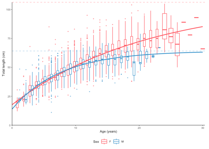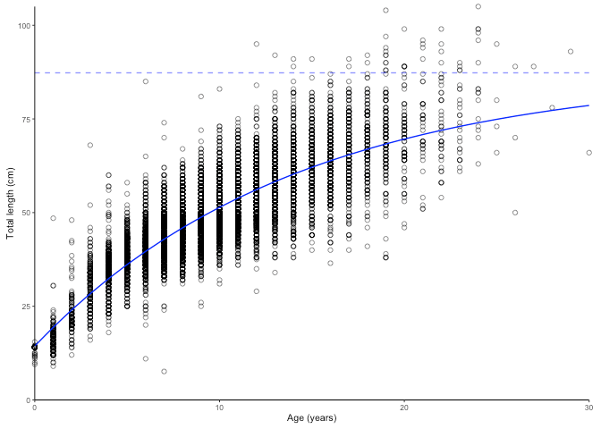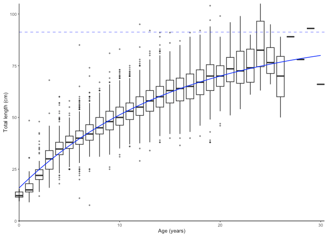 #> [1] "von Bertalanffy growth function coefficients: \n Linf (asymptotic average length) = 91.2 cm +/- 88.3 - 94.6 (95% CIs) \n K (growth rate coefficient) = 0.0633 +/- 0.059 - 0.068 (95% CIs) \n t0 (age at length 0) = -3.04 (years) +/- -3.337 - -2.769 (95% CIs) \n tmax (life span; t0 + 3/K) = 44.4 years \n Number of included specimens = 10401 \n Total number of measured = 618779 \n Excluded (length or age missing): \n Length = 0; age = 608378"
