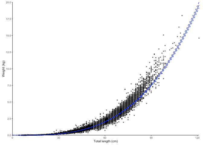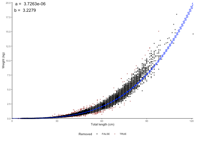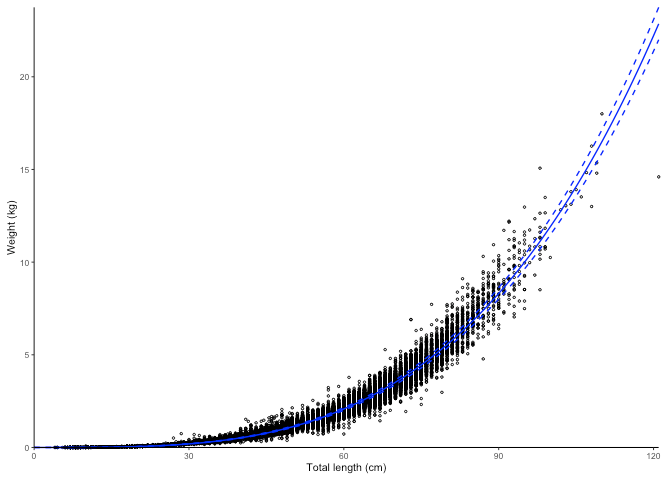 #> [1] "Logarithm transformed linear length-weight model. Not splitted by sex: \n a = 3.8236e-06 +/- 3.7869e-06 - 3.8606e-06 (95% CIs). \n b = 3.221 +/- 3.22 - 3.22 (95% CIs). \n Length in cm and weight in kg \n Number of included specimens = 67457 \n Total number of measured = 618779 \n Excluded (data missing): \n Length = 0; weight = 551322; outlier = 0"