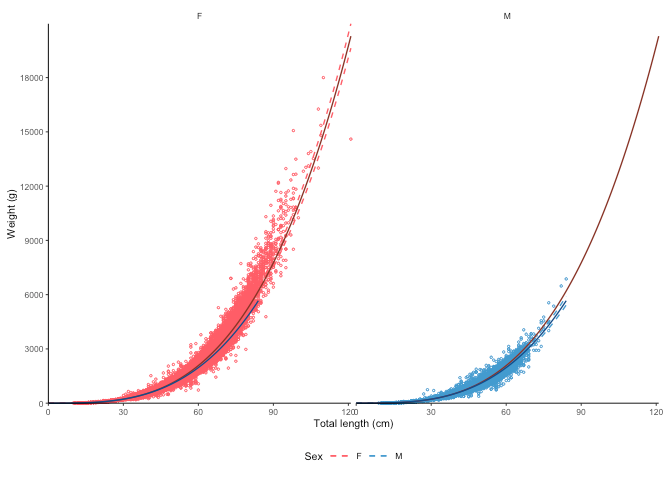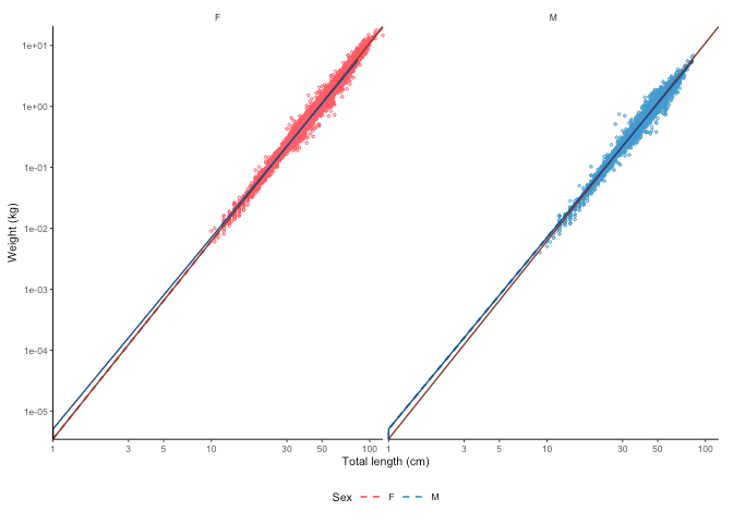 #> [1] "Logarithm transformed linear length-weight model for females and males, respectively: \n a = 0.0035 +/- 0.00344 - 0.00355 (95% CIs) and 0.00507 +/- 0.00497 - 0.00517 (95% CIs). \n b = 3.247 +/- 3.24 - 3.25 (95% CIs) and 3.143 +/- 3.14 - 3.15 (95% CIs). \n Length in cm and weight in g \n Number of included specimens = 34889 and 30354 \n Total number of measured = 618779 \n Excluded (data missing): \n Length = 0; weight = 456891; sex = 96645; outlier = 0"