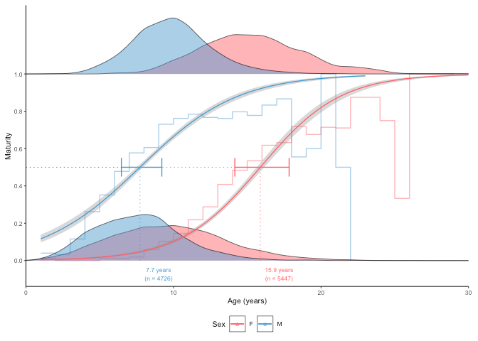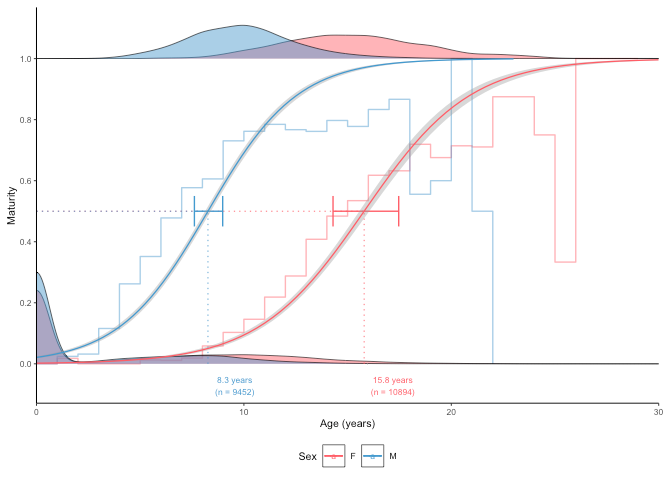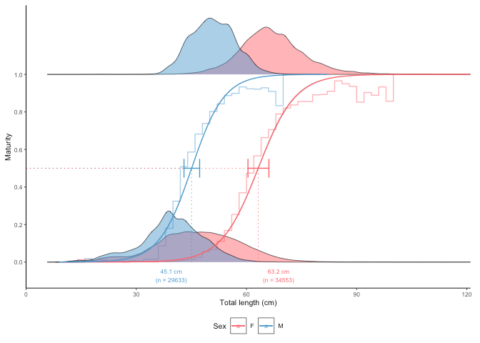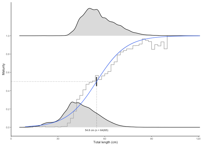 #> [1] "50% maturity at length (L50) based on logit regressions:\n54.812 cm. 95% confidence intervals: 54.584 - 54.924\n Number of specimens: 64265\n\n Confidence intervals estimated using 10 bootstrap replicates."