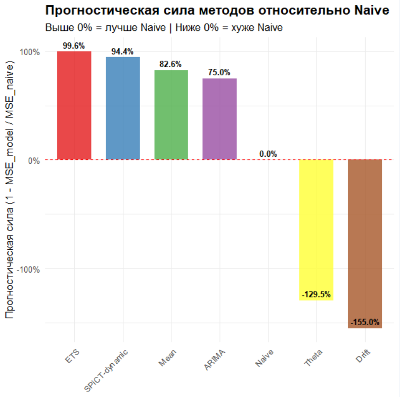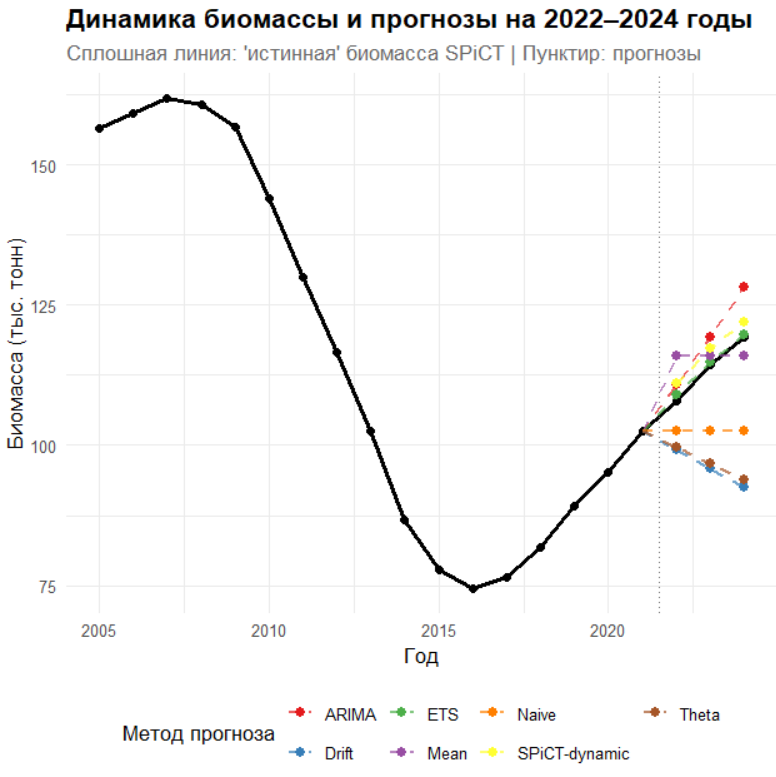 Разные модели отражают разные гипотезы о природе сигнала: инерция и «стягивание к среднему» (Naive/Mean), сглаженный тренд (ETS/Theta), линейная динамика ошибок (ARIMA), механистическая реакция запаса на вылов (SPiCT‑dynamic).