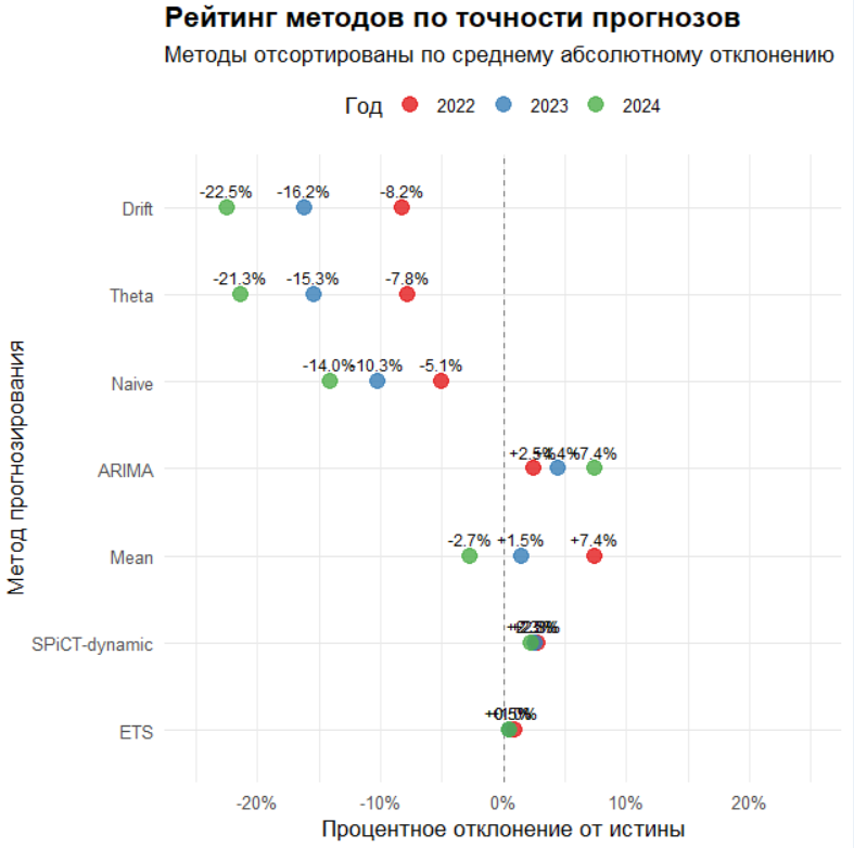 Для оперативного прогноза h = 3 года разумно опираться на связку ETS + SPiCT‑dynamic: первый даёт точные интервалы и минимум смещений, второй — биологическую интерпретируемость и кросс‑проверку уровня при заданной нагрузке.